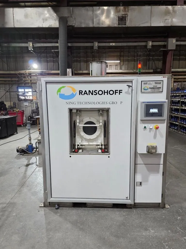 This unit was recently serviced and upgraded in-house at Ransohoff, including the addition of a new PLC control system, new ultrasonics, and a fresh water line rinse-to-drain system.